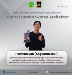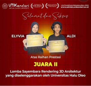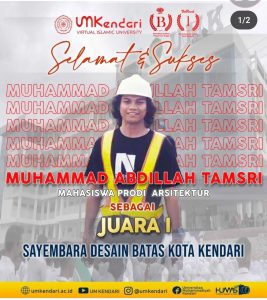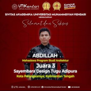 PrestasiBerikut ini daftar prestasi yang terlah diraih oleh mahasiswa arsitektur UM kendari.ADITIYA HARDIKA (MAHASISWA ARSITEKTUR ANGKATAN 2025) ATAS KEMENAGANNYA DI KEGIATAN EXPO 2024 YANG DI ADAKAN OLEH HMA SI UNIVERSITAS HALU OLEO ARSITEKTURAgustus 14, 2025Dude Arlino PESERTA TERBAIK Sayembara Desain Arsitektur dalam rangka Hari Lahir ke-5 PT Renovasi Konstruksi Indonesia (Renovki.com)Agustus 14, 2025MUHAMMAD AFRIYATNO (MAHASISWA ARSITEKTUR ANGKATAN 2022) SEBAGAI FINALIS KOMPETISI DESAIN INTERIOR HDII PROVINSI BANTENAgustus 14, 2025NADILA AULIA IDRIS MAHASISWI ARSITEKTUR ANGKATAN 2022 JUARA KE 2 LOMBA PHOTOGRAPHYAgustus 14, 2025FARIS Juara I Kejuaraan Wilayah I Perguruan Seni Bela Diri Indonesia Tapak Suci Putra Muhammadiyah Provinsi Sulawesi Tenggara Kategori Dewasa Kelas BAgustus 14, 2025Hermansyah juara 1 lomba Sketsa Arsitektur pada Architecural Exhibition XXIII HimpunanMahasiswa Arsitektur D3 Fakultas Teknik Universitas Haluoleo.Agustus 14, 2025ASBAR SAPUTRA MERAIH MEDALI PERUNGGU PADA CABANG OLAHRAGA HAPKIDO PEKAN OLAHRAGA PROVINSI SULAWESI TENGGARA XIV 2022Agustus 14, 2025MAHASISWA ARSITEKTUR UM KENDARI Juara 2 Kompetisi Desain pada ARCHITECTUR FESTIVAL EXHIBITION UNIVERSITAS MUHAMMADIYAH MAKASSARAgustus 14, 2025ELYVIA dan ALDI JUARA II Lomba Sayembara Rendering 3D Arsitektur yang diselenggarakan oleh Universitas Halu OleoAgustus 14, 2025MAHASISWA ARSITEKTUR ANGKATAN 2024 JUARA KE 3 LOMBA MAKETAgustus 14, 2025Prestasi7 Mahasiswa UM Kendari Lulus Sebagai Penerima Hibah International Credit Transfer (ICT)Januari 28, 2024PrestasiMUHAMMAD ABDILLAH TAMSRI JUARA 1 SAYEMBARA DESAIN BATAS KOTA KENDARIJanuari 28, 2024PrestasiABDILLAH Juara 3 Sayembara Design Tugu Adipura Kota Palangkaraya, Kalimantan TengahJanuari 28, 2024 12Jadwal Lomba Terdekat. ADITIYA HARDIKA (MAHASISWA ARSITEKTUR ANGKATAN 2025) ATAS KEMENAGANNYA DI KEGIATAN EXPO 2024 YANG DI ADAKAN OLEH HMA SI UNIVERSITAS HALU OLEO ARSITEKTUR Dude Arlino PESERTA TERBAIK Sayembara Desain Arsitektur dalam rangka Hari Lahir ke-5 PT Renovasi Konstruksi Indonesia (Renovki.com) MUHAMMAD AFRIYATNO (MAHASISWA ARSITEKTUR ANGKATAN 2022) SEBAGAI FINALIS KOMPETISI DESAIN INTERIOR HDII PROVINSI BANTEN